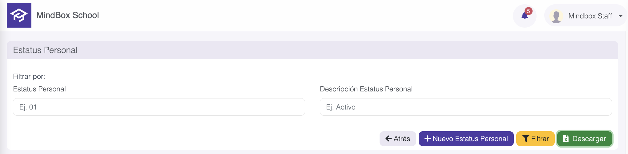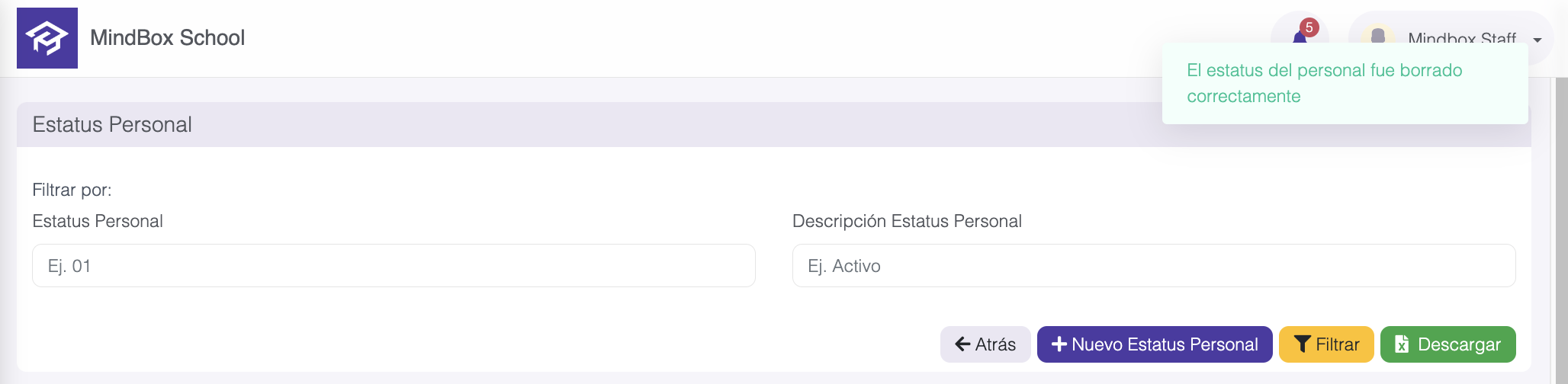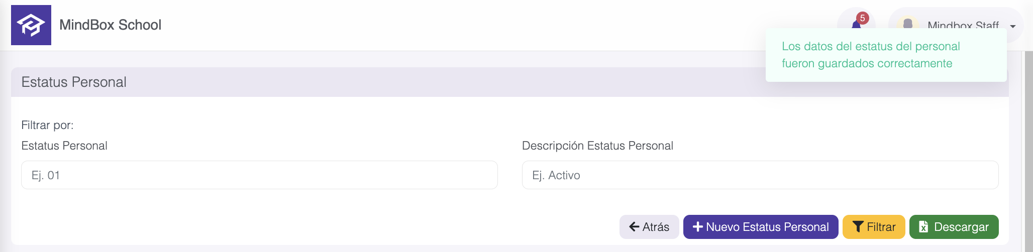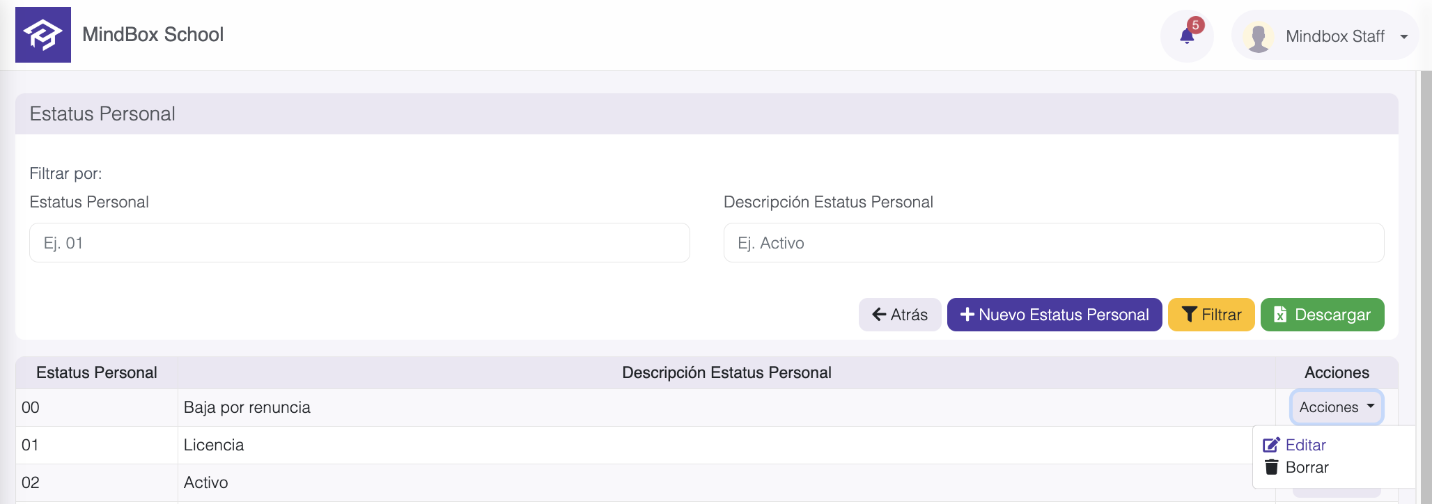 En este contexto, <mark style="color:purple;">**MindBox**</mark> te permite llevar a cabo la gestión de los diferentes estatus del personal de tu institución, ya que a través de la plataforma se puede realizar el registro de un nuevo estatus y editar o eliminar alguno existente.&#x20;