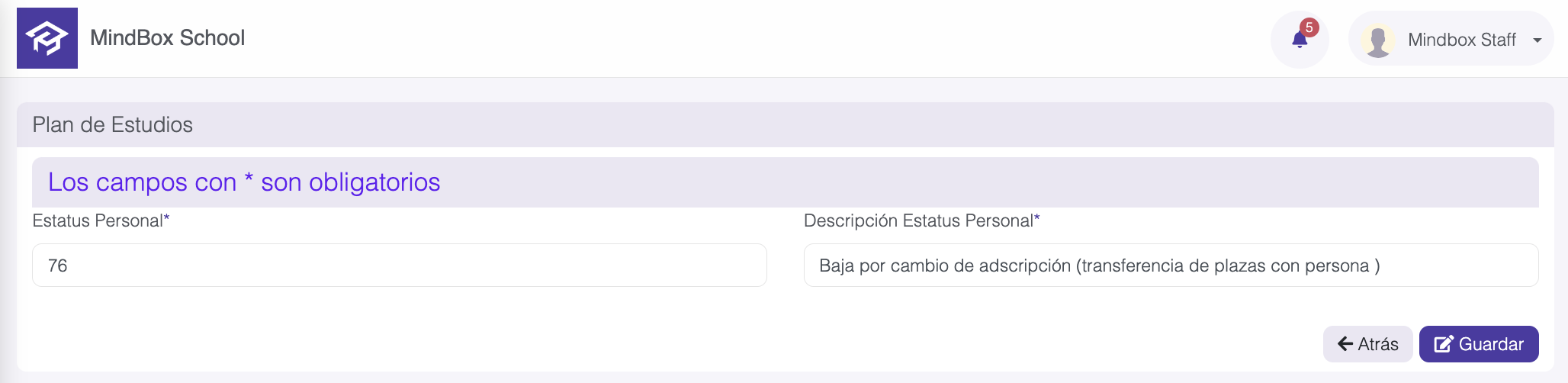 * **Descripción:** en este campo se debe ingresar el nombre o descripción del nuevo estatus del personal. Esta descripción debe ser clara y concisa, ya que aparecerá en los registros administrativos y puede ser visible en reportes y documentos oficiales de la institución.