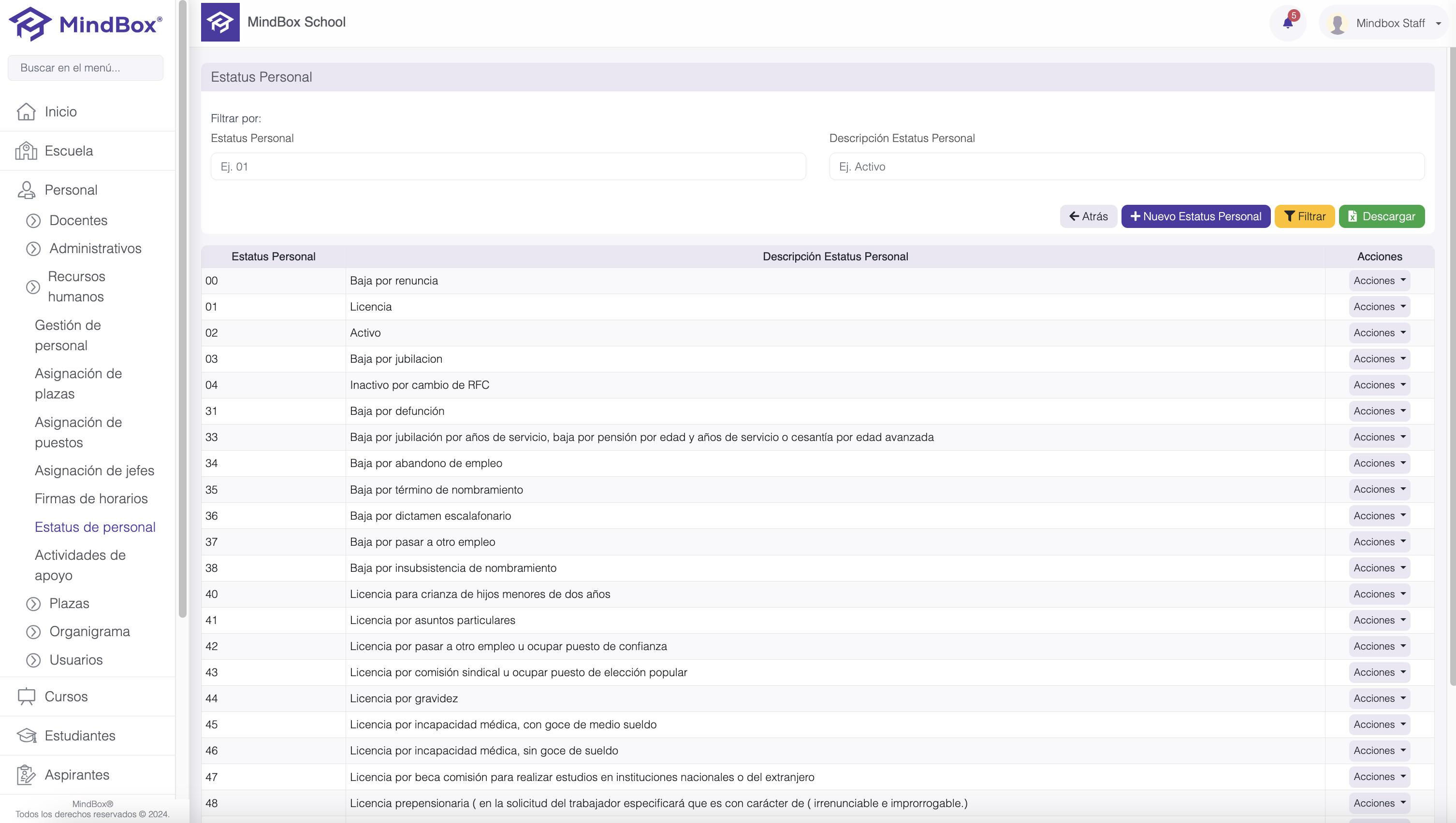 En este listado es posible observar información relevante sobre la situación laboral actual de cada miembro del personal tal como la clave y descripción del estatus del personal. Además, <mark style="color:purple;">**MindBox**</mark> permite modificar y eliminar dichos estatus previamente registradas.