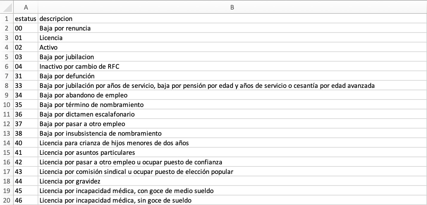 La plataforma descargará un archivo <mark style="color:purple;">**`.XLSX`**</mark> en el cual se encontrará el listado de los estatus del personal registrados en la plataforma e información general tal como la clave y descripción o detalle sobre la posible situación laboral del personal de la institución.